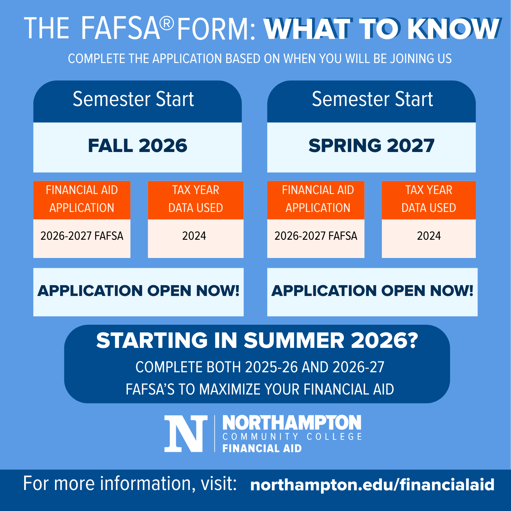 The first step to receiving NCC financial aid is completing a Free Application for Federal Student Aid (FAFSA). The NCC federal school code is 007191 - you’ll need this to complete the FAFSA. You should complete your FAFSA by May 1 for fall semester start and October 1 for spring semester start.