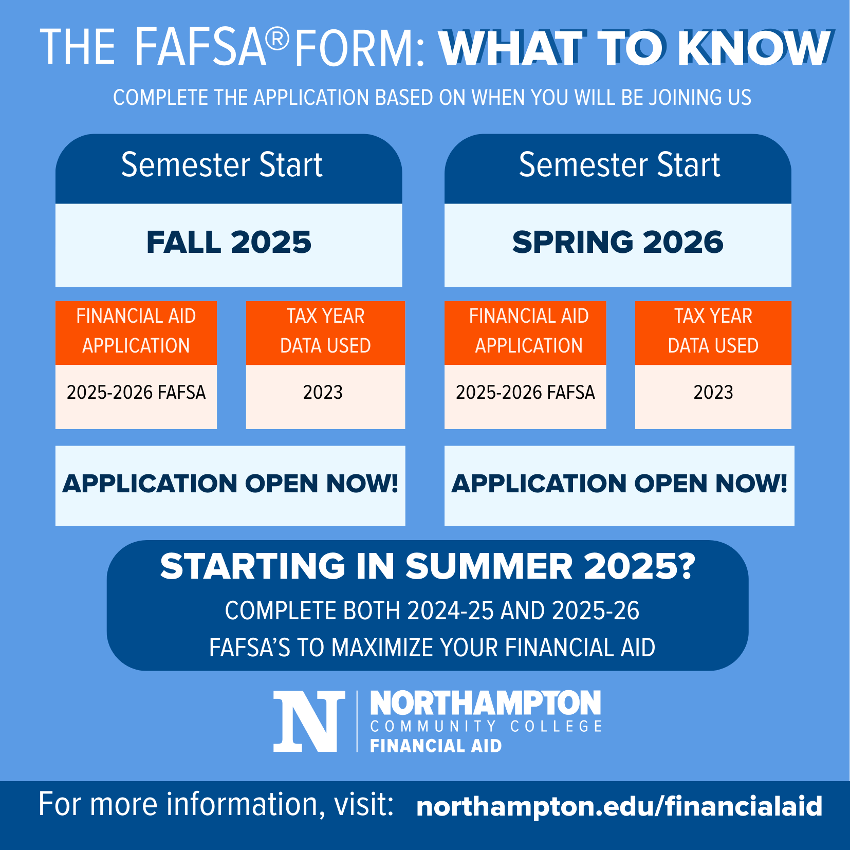 The first step to receiving NCC financial aid is completing a Free Application for Federal Student Aid (FAFSA). The NCC federal school code is 007191 - you’ll need this to complete the FAFSA. You should complete your FAFSA by May 1 for fall semester start and October 1 for spring semester start.