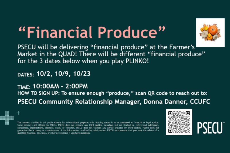 PSECU will be delivering “financial produce” outside in the QUAD where the Farmer’s Market is located. There will be different “financial produce” for the 3 dates below when you play PLINKO!WHEN: Wednesday: 10/2, 10/9, 10/23