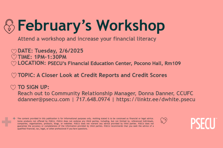 PSECU will provide a monthly opportunity to attend a financial literacy workshop on campus at the PSECU office (FEC). You may also take advantage of the "By appointment hours only” and schedule your own financial literacy workshop.There is no time like the present to start increasing your financial knowledge. Make a financial literacy goal and achieve that goal by creating a plan! February will be the month of "A Closer Look at Credit Reports & Credit Scores." Each month will be a different financial topic.