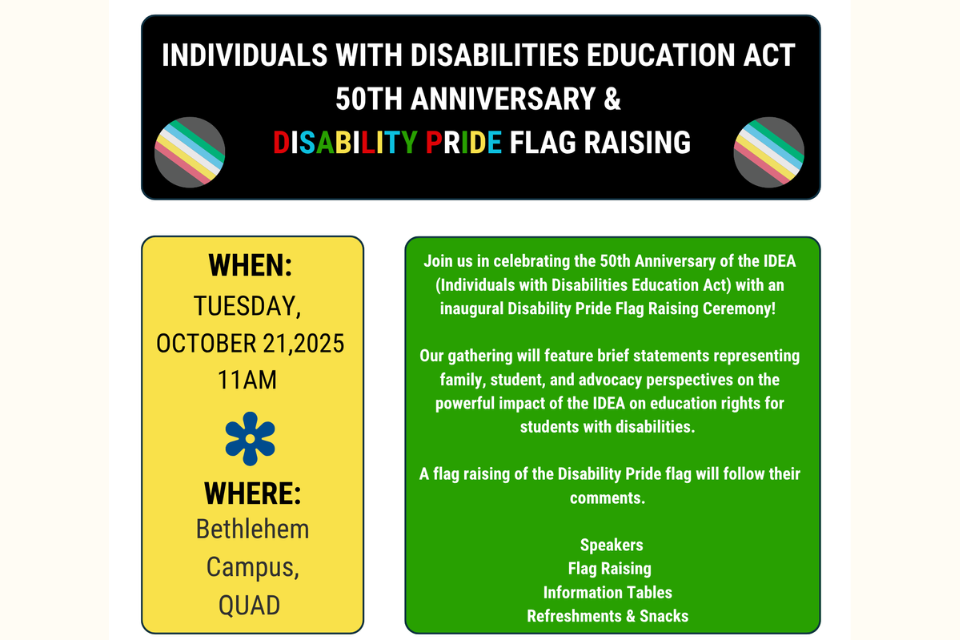 Join us in honoring the 50th Anniversary of the Individuals with Disabilities Education Act (IDEA) with our Inaugural Disability Pride Flag Raising Ceremony — a celebration that brings together our campus community and the community at large in recognition of inclusion, access, and the rights of individuals with disabilities in education and beyond.Please see flyer for event details.