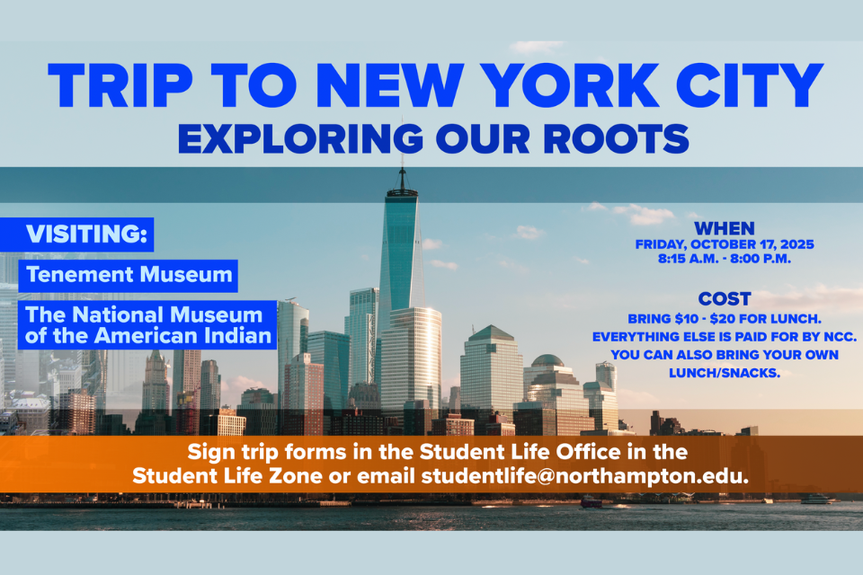Trip to New York City, visiting the Tenement Museum and the National Museum of the American Indian. Free to students. Sign-up on Sept. 15 in the Student Life Zone.Related Events