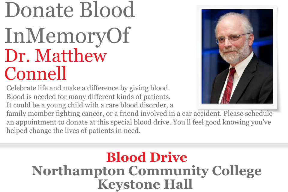 In memory of Dr. Matt Connell, former Dean of the NCC Monroe Campus, please consider donating blood at this Nov. 12 Blood Drive at the NCC Pocono Campus to celebrate life and make a difference!Blood is needed for many different kinds of patients. It could be a young child with a rare blood disorder, a