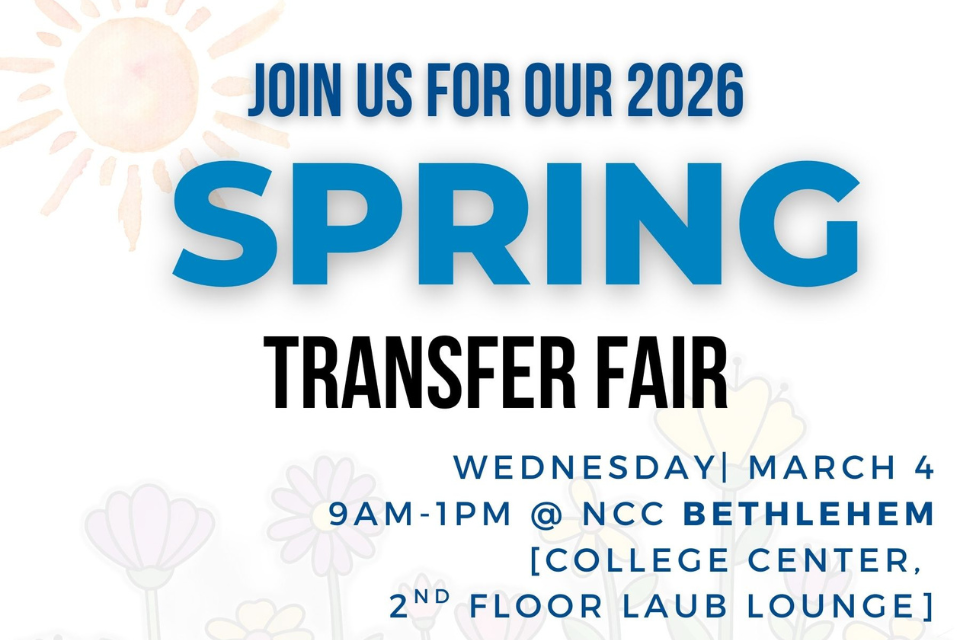 Please join us for the Spring 2026 Transfer Fair @ NCC Pocono on Monday, 03/02 from 9:00AM-1:00PM in Kapp Hall, 2nd Floor Lobby. We will host our most popular transfer colleges & universities admissions staff. They will be present to speak with students about their transfer plans, the transfer process, and much more!