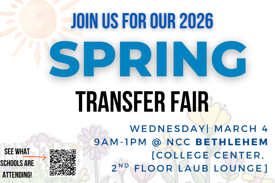 Please join us for the Spring 2026 Transfer Fair @ NCC Bethlehem on Wednesday, 03/04 from 9:00AM-1:00PM in the College Center, 2nd Floor Laub Lounge. We will be joined by 50+ colleges and universities who send their transfer admissions team to speak with students about their transfer plans, transfer process, and much more! Visit the link here for a list of schools who will be attending: https://www.northampton.edu/education-and-training/transfer-options/transfer-fair-college-list.html