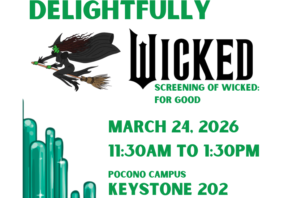 Bring your friends, have some popcorn and take a movie break! Wicked: For Good screening March 24th, 11:30am-1:30pm in Keystone 202, Pocono Campus.Related Events