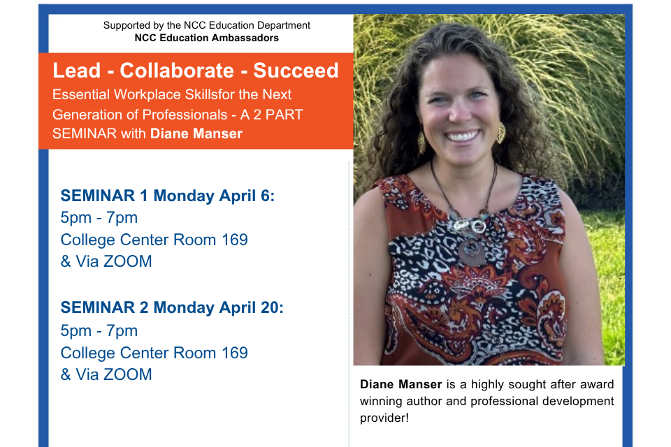 Join us for an engaging **2-part professional development seminar** designed to help you build the skills needed for career success. Led by award-winning author and facilitator Diane Manser, these interactive sessions focus on resilience, collaboration, communication, and emotional intelligence to strengthen your workplace readiness and professional growth. This is also a great opportunity to **expand your professional network** while connecting with peers and professionals. Open to all students—connect, grow, and take the next step toward your future!