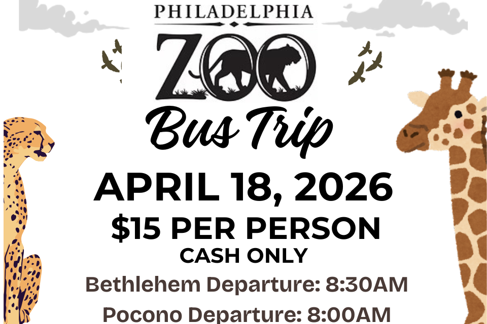 Spend the day at the Philadelphia Zoo! Bus leaves Pocono campus at 8am on April 18th. Sign ups start January 26th. Space is limited. NCC Student cost is $15 (cash) per person. First come, first serve. No refunds if you cancel. Bus leaves Pocono at 8:00 am. Bethlehem Departure: 8:30AM