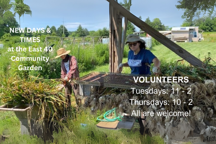 Come get your hands in the soil - learn to build projects - enjoy being outdoors!Yes, the volunteer hours at the East 40 (the 40+ acres on the east side of campus) are back - come on out between 11-2 on Tuesdays, and 10-2 on Thursdays. Always a good time to learn some new skills and meet new people.