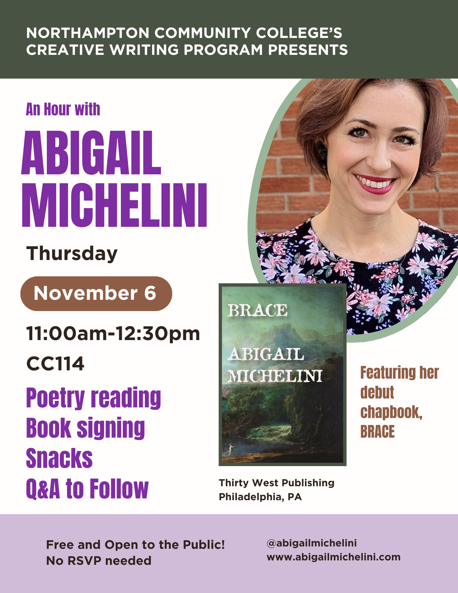 NCC professor Abigail Michelini's debut chapbook of poetry, Brace, was published in the spring. Come hear Dr. Michelini read from and discuss her work. Q&A and book signing to follow. Snacks will be provided as well. The event is free and open to the public, and is presented by NCC's Creative Writing program.